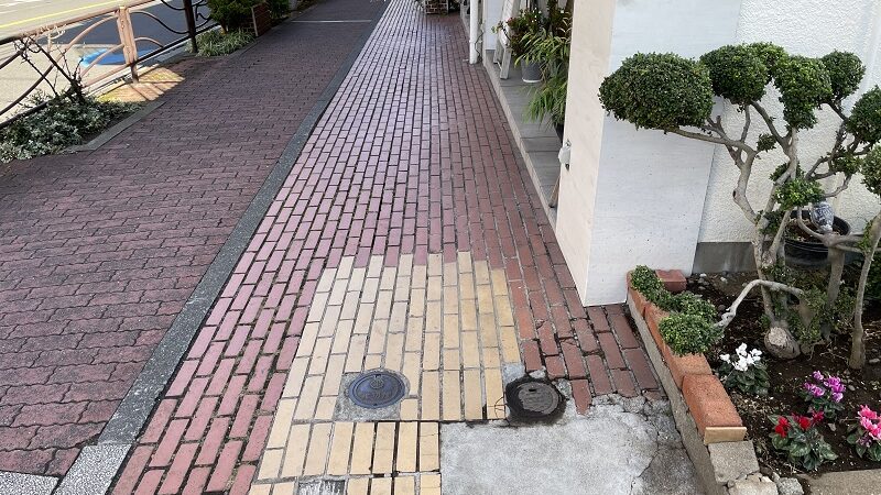 レンガ敷きの床の一部に段差や浮きが見られ、歩行時に危険な箇所がありました。