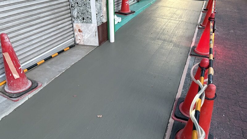テナント様の休業日に合わせてコンクリート打設を行い、臭気のあるトップコートは夜間に塗布するなど、工夫を重ねて無事に施工を完了できました。