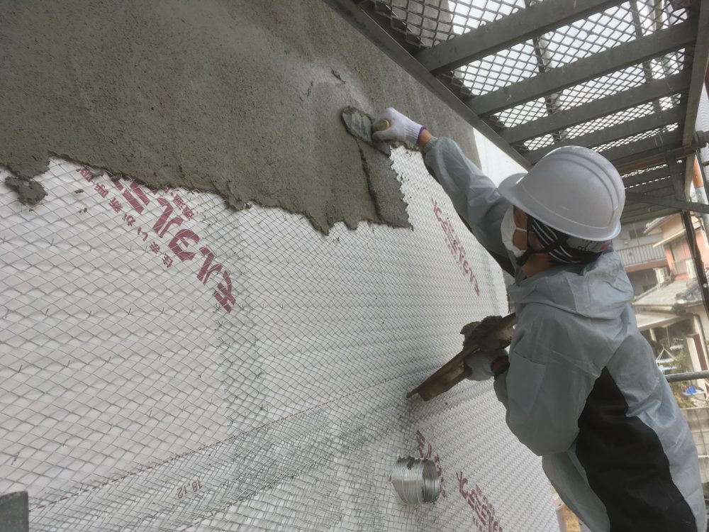 波板ラスを張り込んだあとに、下塗り材を塗付けていきます。