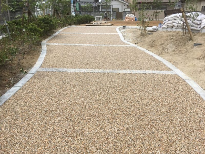 公園の歩道に自然石樹脂舗装を施工 淡路砂利を使用した景観舗装事例「耐久性・美観に優れた外構仕上げ」