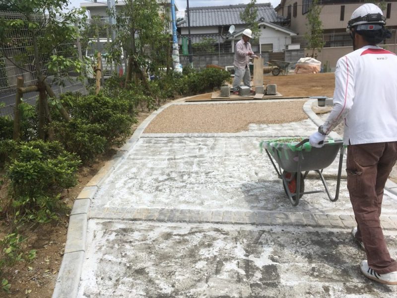 プライマー乾燥後、淡路砂利、樹脂をミキサーで攪拌し、一輪車で材料を運搬して施工していきます。