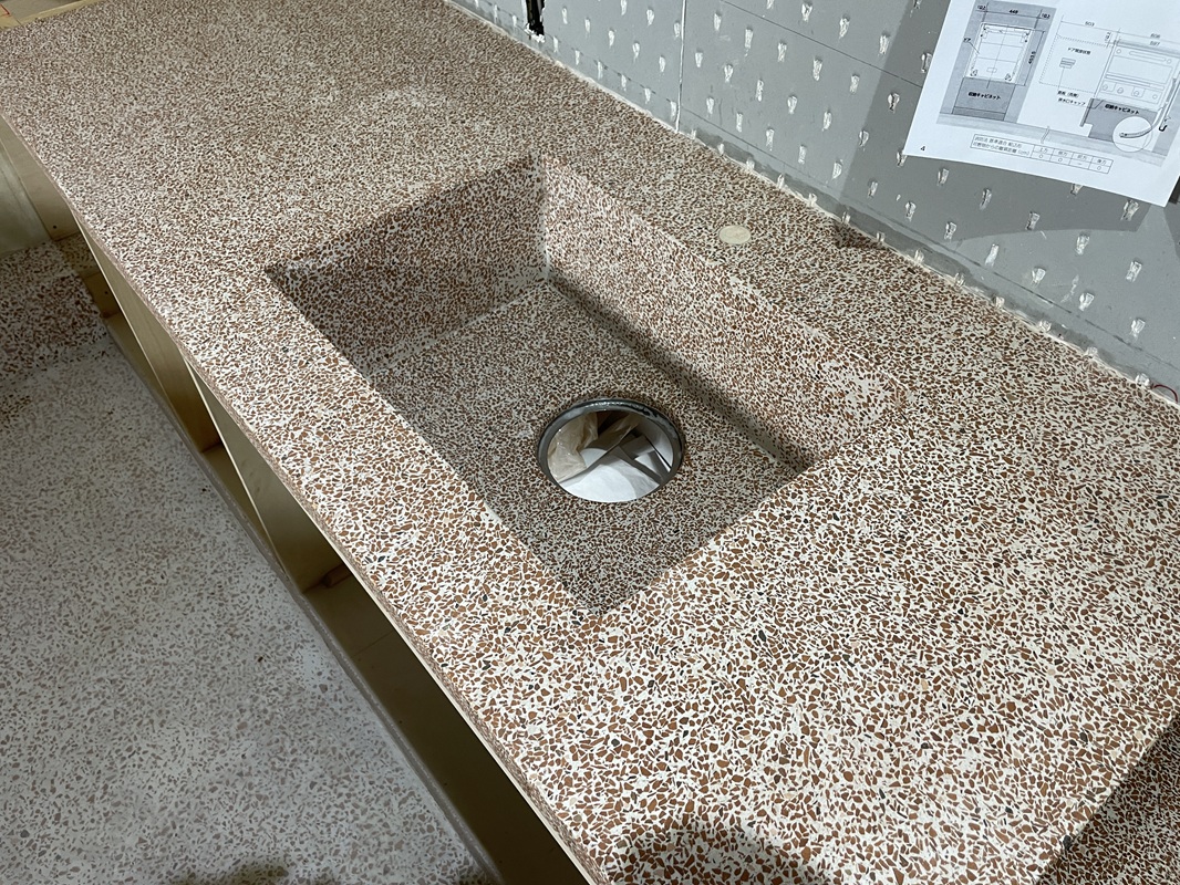 店舗カウンターや商業施設、オフィスなどで人気のテラゾーカウンター施工例です。 セメントと天然砂利を練り合わせて造られた美しいテラゾー仕上げは、デザイン性と耐久性を兼ね備えたプロ仕様の仕上げです。 |
